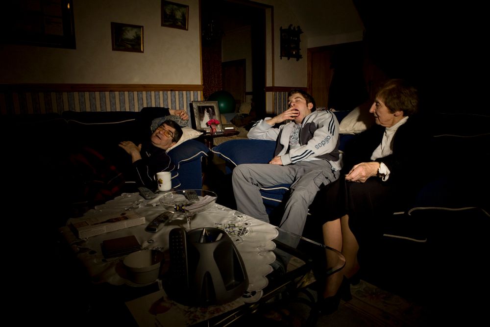 Here, in front of the TV, perhaps with close family or friends, a person’s behaviour is undoubtedly different from when they are outside – at work, in the supermarket, in a bar – and coming across strangers and less familiar surroundings. This very private space in which people watch TV is, of course, quite unlike the very public space that appears on the TV they are watching. But that distinction is not always so clear and is something that Alessandra has been looking at by photographing people in their own homes. Certainly, the line is blurred in the act of setting up and photographing such a scene.